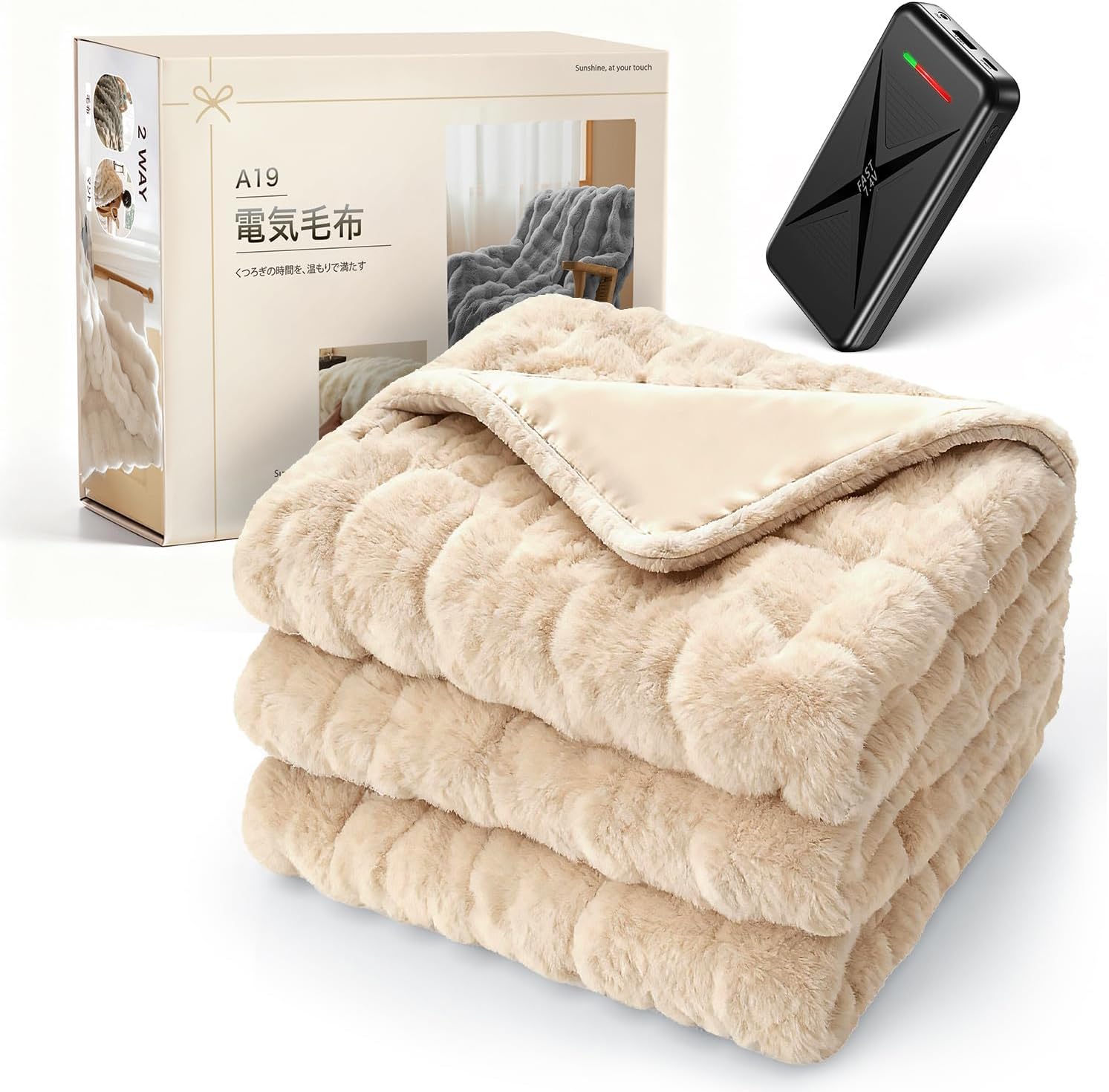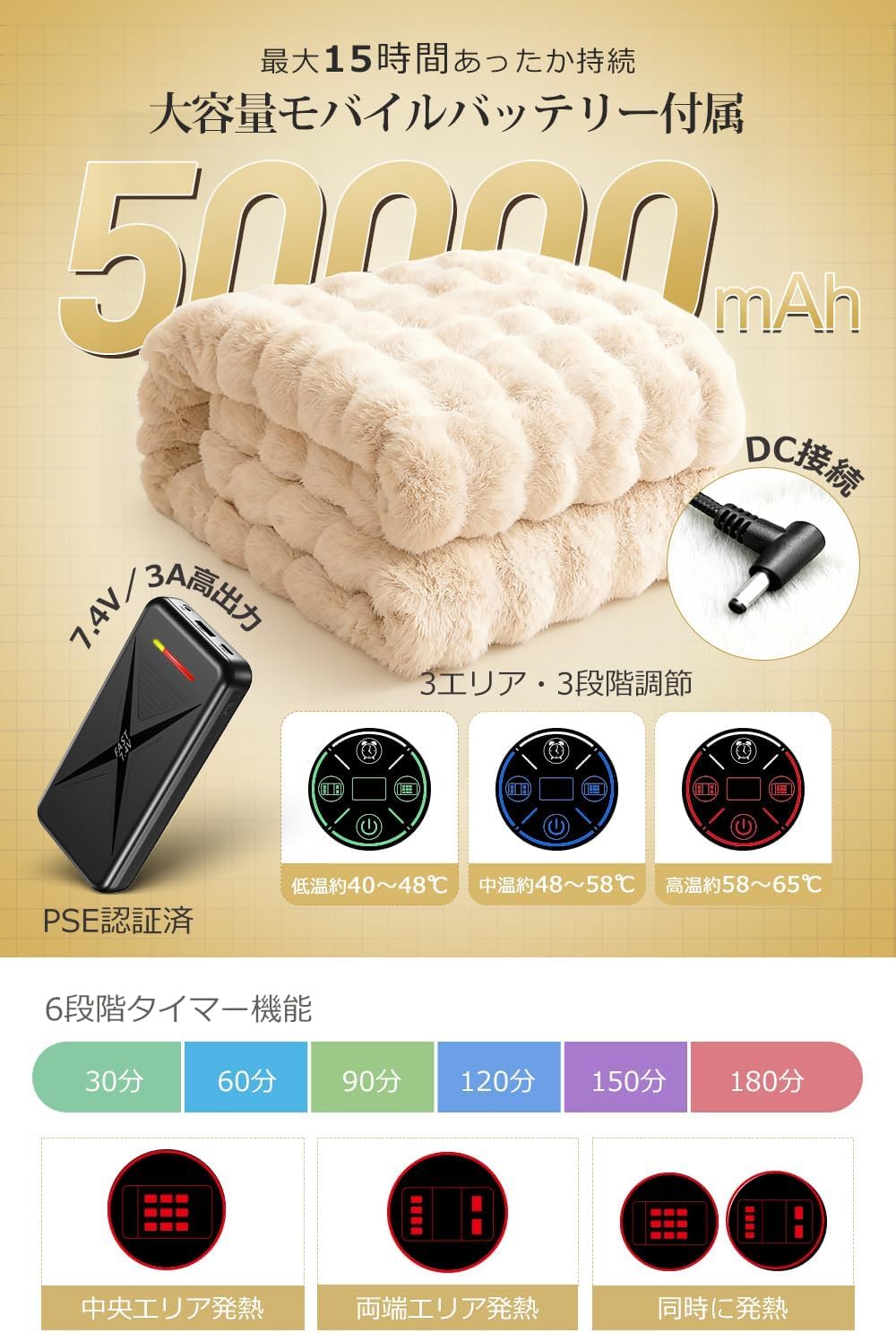 大容量・高出力モバイルバッテリー付&電気毛布にもスマホにも。50000mAhの大容量モバイルバッテリー付きで、長時間の使用も安心。DC端子対応・7.4V/3Aの高出力設計により、従来の5V/2Aバッテリーと比べて加熱効率が大幅にアップ。寒い冬でもすぐに温まり、安定した暖かさを持続します。USB出力ポートも搭載しているため、スマートフォンやタブレットへの充電も可能。ベッド・ソファ・キャンプ・車中泊など、屋内外問わず自由に使用でき、1台で電気毛布もモバイル機器も同時にサポートします。軽量で持ち運びやすく、高出力で効率的な電力供給ができるため、電気代も節約可能。安全性にも配慮された、冬の必携アイテムです。